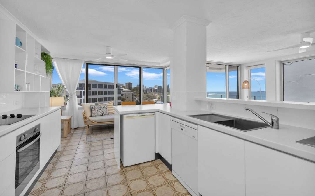 Set in a prime position just behind Rolling Surf Resort at 14 Levuka Avenue, Kings Beach, the apartment offers sweeping ocean views from its elevated fourth-floor location.